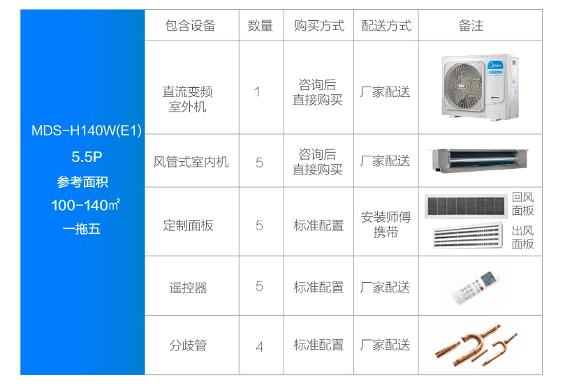 美的 一拖五變頻一級(jí)能效 多聯(lián)風(fēng)管機(jī) 6匹 家用中央空調(diào) MDS-H140W(E1)
